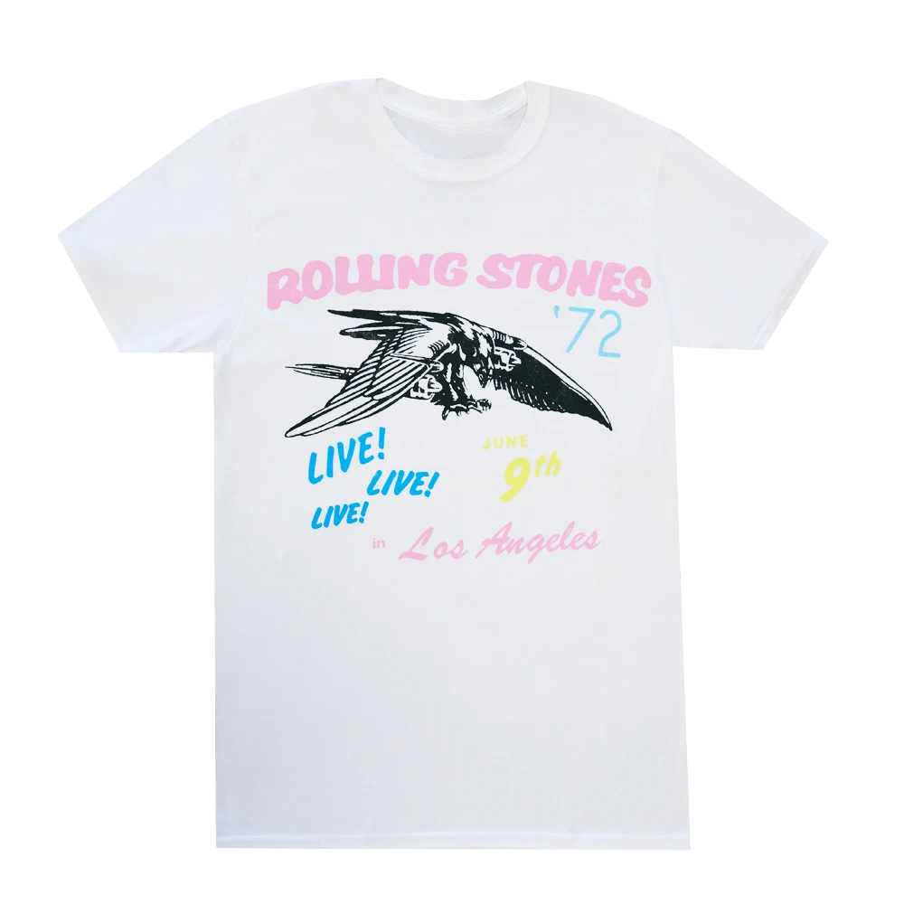 Soft white t-shirt, featuring artwork inspired by a bootleg Rolling Stones t-shirt from their June 9, 1972 Los Angeles tour date.